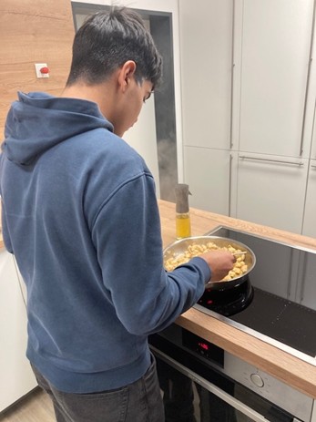 Während in den Bereichen Holz und Metall verschiedene Werkstücke hergestellt wurden (z.B. Handyhalterung, Würfel) kochten und backten die Schüler*innen im Bereich Hauswirtschaft und luden die Lehrkräfte am Freitag zu einem leckeren 3-Gänge-Menü ein. Im Bereich Pflege und Soziales erfuhren die Schüler*innen unter anderem, wie es ist, in einem Rollstuhl zu sitzen, mit eingeschränkter Sehfähigkeit (durch eine entsprechend präparierte Brille) verschiedene Aufgaben zu bewältigen oder durch die anderen Schüler*innen blind geführt zu werden. Die Schüler*innen, die den Bereich Maler/Farbe gewählt hatten, tapezierten, vergrößerten, zeichneten und malten eifrig.