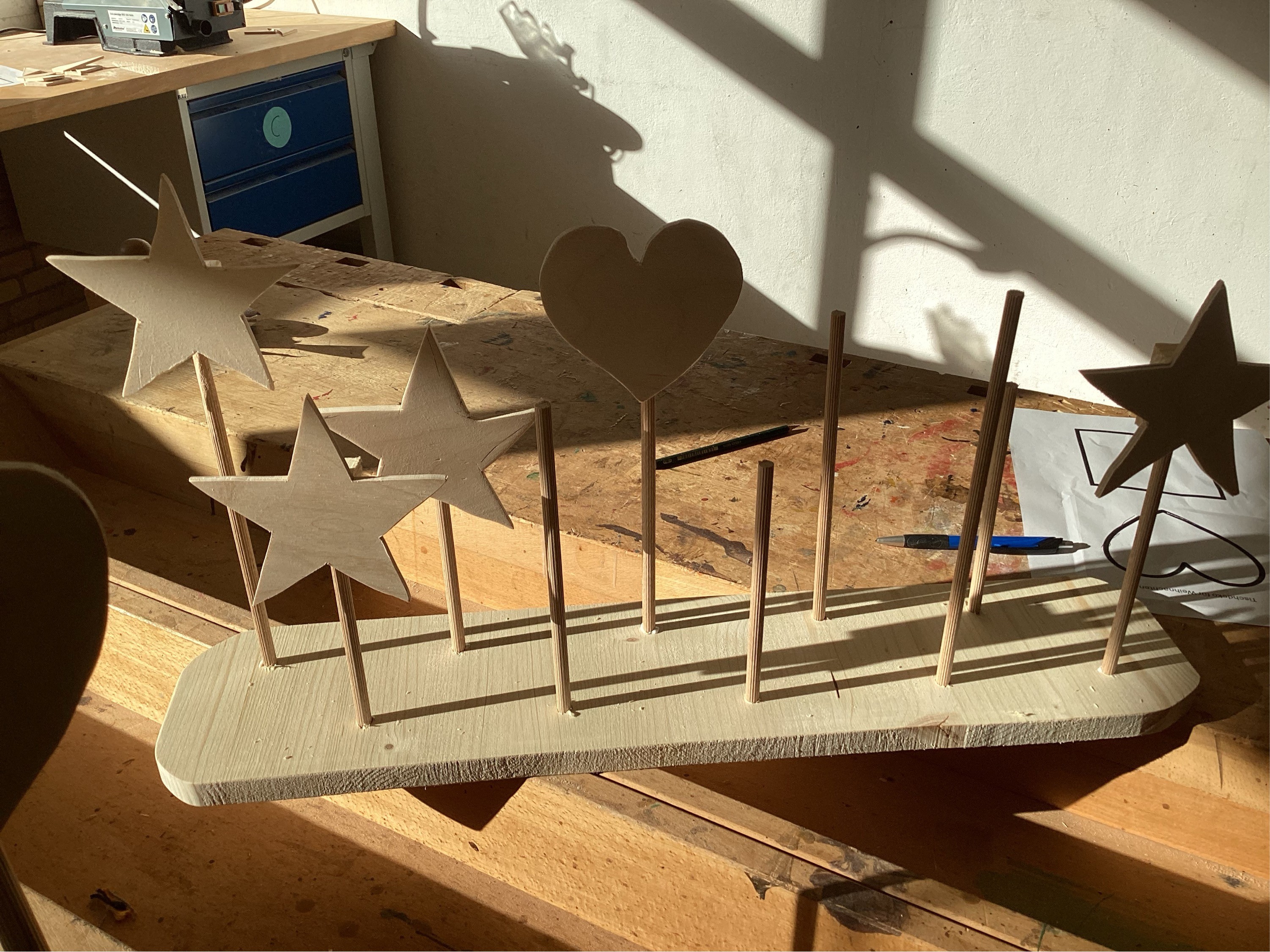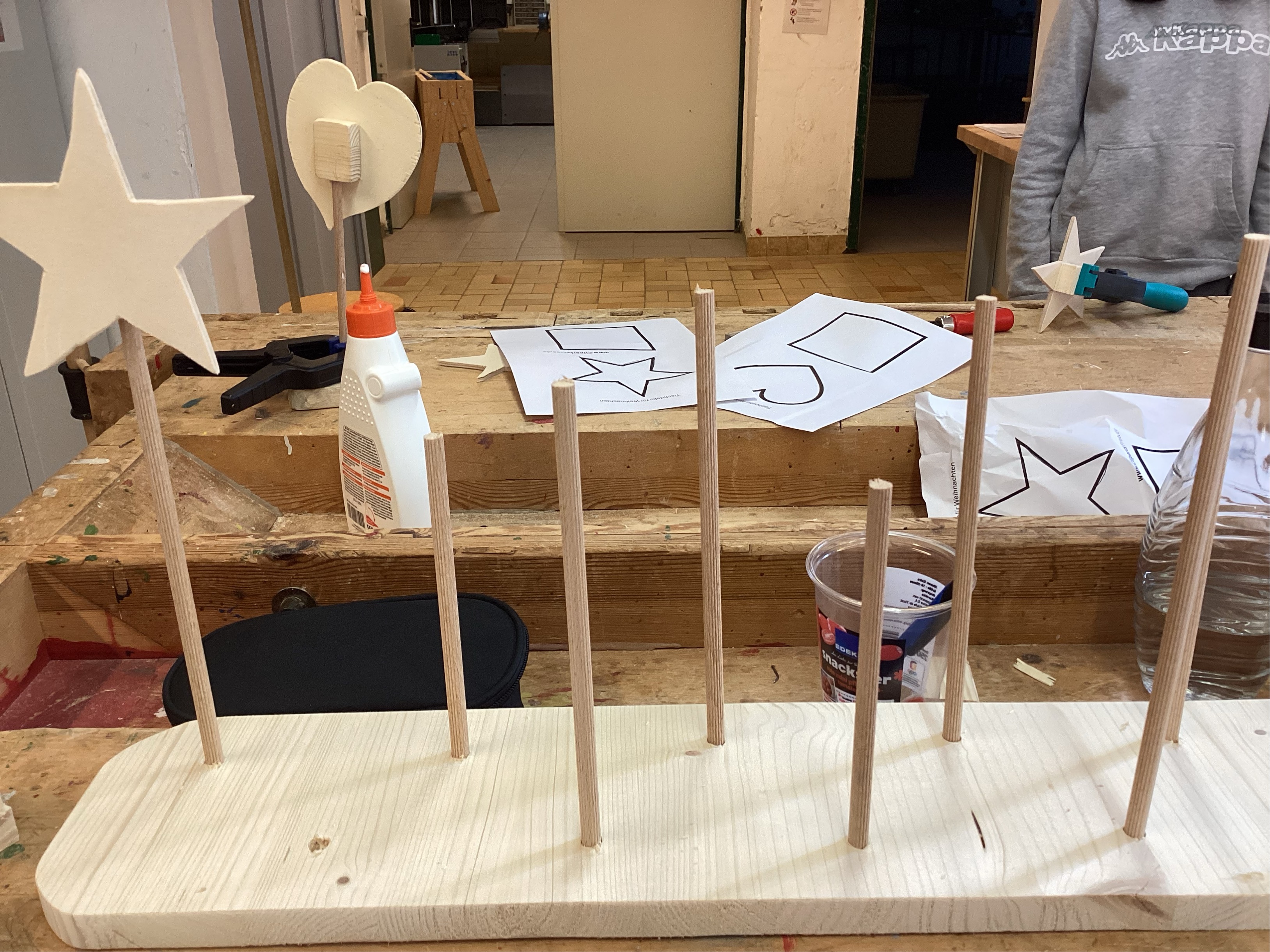 Im Bereich Holzwerken wurden die Schüler*innen zunächst mit den wichtigsten Sicherheitsregeln im Werkraum vertraut gemacht. Da hier teilweise mit Maschinen gearbeitet wird, stand die Unterweisung zur sicheren Bedienung an erster Stelle. Im Anschluß daran lernten die Jugendlichen an mehreren Stationen grundlegende handwerkliche Tätigkeiten kennen und übten diese praktisch ein, darunter: Sägen, Bohren, Hämmern und Leimen. Gut vorbereitet konnten die Schüler*innen danach zwei eigene Werkstücke herstellen: Stern- und Herzständer für den Basar am Elternsprechtag.