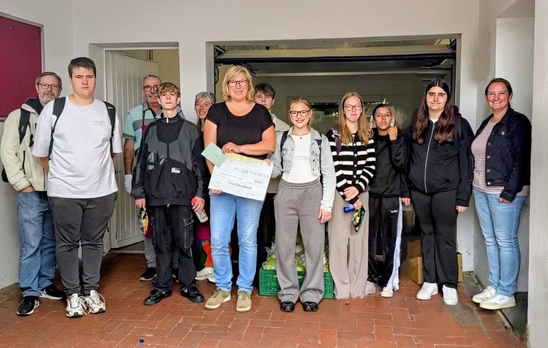 Am Donnerstag, dem 10. Juli 2025, machten sich acht Schüler*innen der 9. Klasse der Grüterschule Mettingen gemeinsam mit ihrer Klassenlehrerin, Frau Landwehr, auf den Weg nach Ibbenbüren, um einen Scheck über 500 € an die Tafeleinrichtung zu übergeben. Diese Spende wurde im Rahmen des jährlichen „Sozialen Schüler*innen Tages“ gesammelt. Die Schüler*innen der Schülervertretung (SV) haben in einer demokratischen Abstimmung zwei Spendenempfänger auswählten: die Tafel Ibbenbüren und den Tierschutzverein Lengerich-Westerkappeln.Bei der Ankunft in der Tafeleinrichtung wurden die Schüler*innen herzlich von den Mitarbeitenden empfangen. Besonders Frau Berardis zeigte sich sehr erfreut über die großzügige Spende und nahm sich viel Zeit, um den Jugendlichen einen Einblick in die wichtigen Abläufe der Einrichtung zu geben. Die Schüler*innen hatten die Gelegenheit, mehr über die wertvolle Arbeit der Tafel zu erfahren und zu sehen, wie ihre Spende direkt dazu beiträgt, Menschen in Not zu unterstützen.