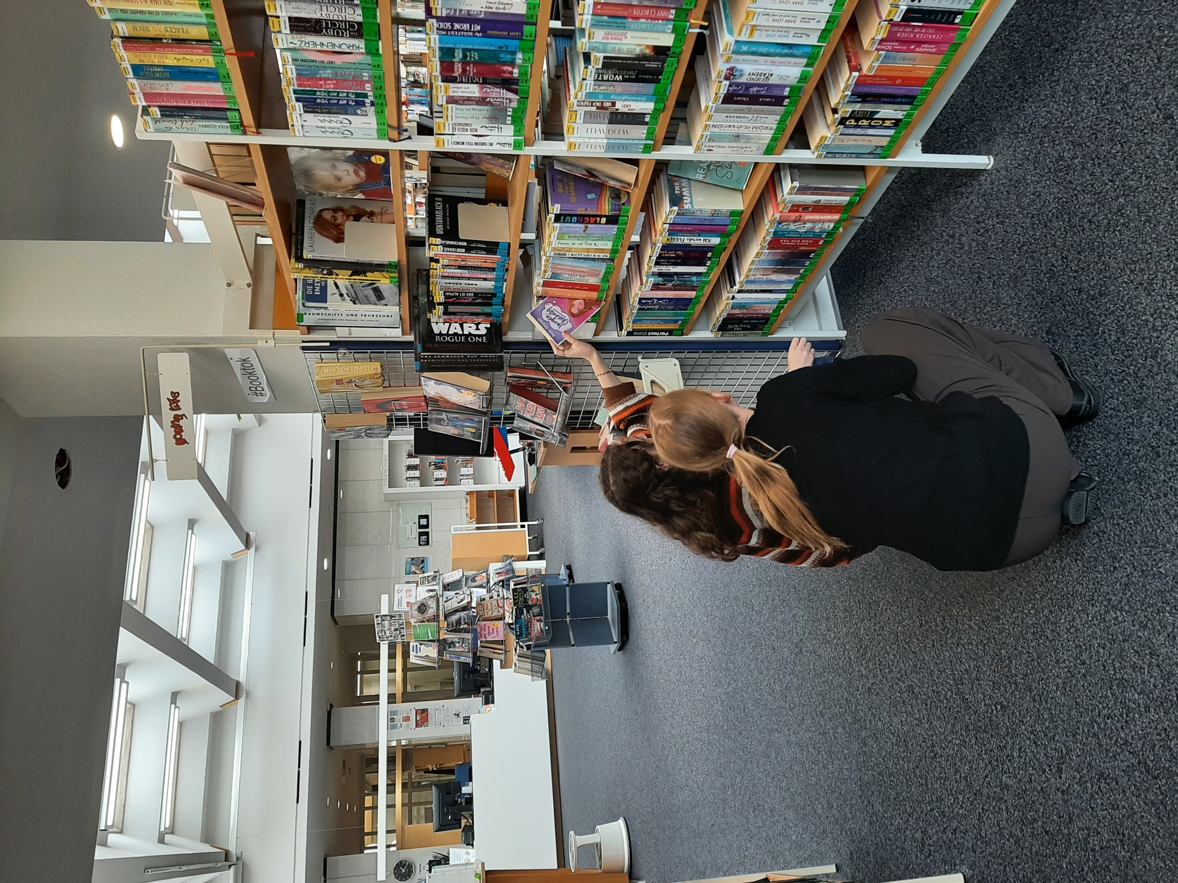 Zu Beginn führte Frau Schnittker die Gruppe durch die verschiedenen Abteilungen der Bücherei. Sie erklärte, welche Bücher und Medien dort zu finden sind und wie man gezielt nach bestimmten Titeln suchen und diese ausleihen kann. Außerdem stellte sie weitere Angebote der Bücherei vor – darunter das Drucken mit dem 3D-Drucker, das Arbeiten mit Plottern sowie verschiedene Workshops und kreative Aktionen.