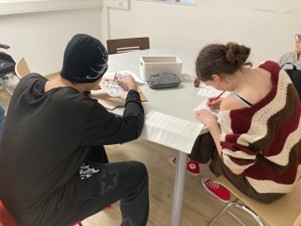 Während in den Bereichen Holz und Metall verschiedene Werkstücke hergestellt wurden (z.B. Handyhalterung, Würfel) kochten und backten die Schüler*innen im Bereich Hauswirtschaft und luden die Lehrkräfte am Freitag zu einem leckeren 3-Gänge-Menü ein. Im Bereich Pflege und Soziales erfuhren die Schüler*innen unter anderem, wie es ist, in einem Rollstuhl zu sitzen, mit eingeschränkter Sehfähigkeit (durch eine entsprechend präparierte Brille) verschiedene Aufgaben zu bewältigen oder durch die anderen Schüler*innen blind geführt zu werden. Die Schüler*innen, die den Bereich Maler/Farbe gewählt hatten, tapezierten, vergrößerten, zeichneten und malten eifrig.