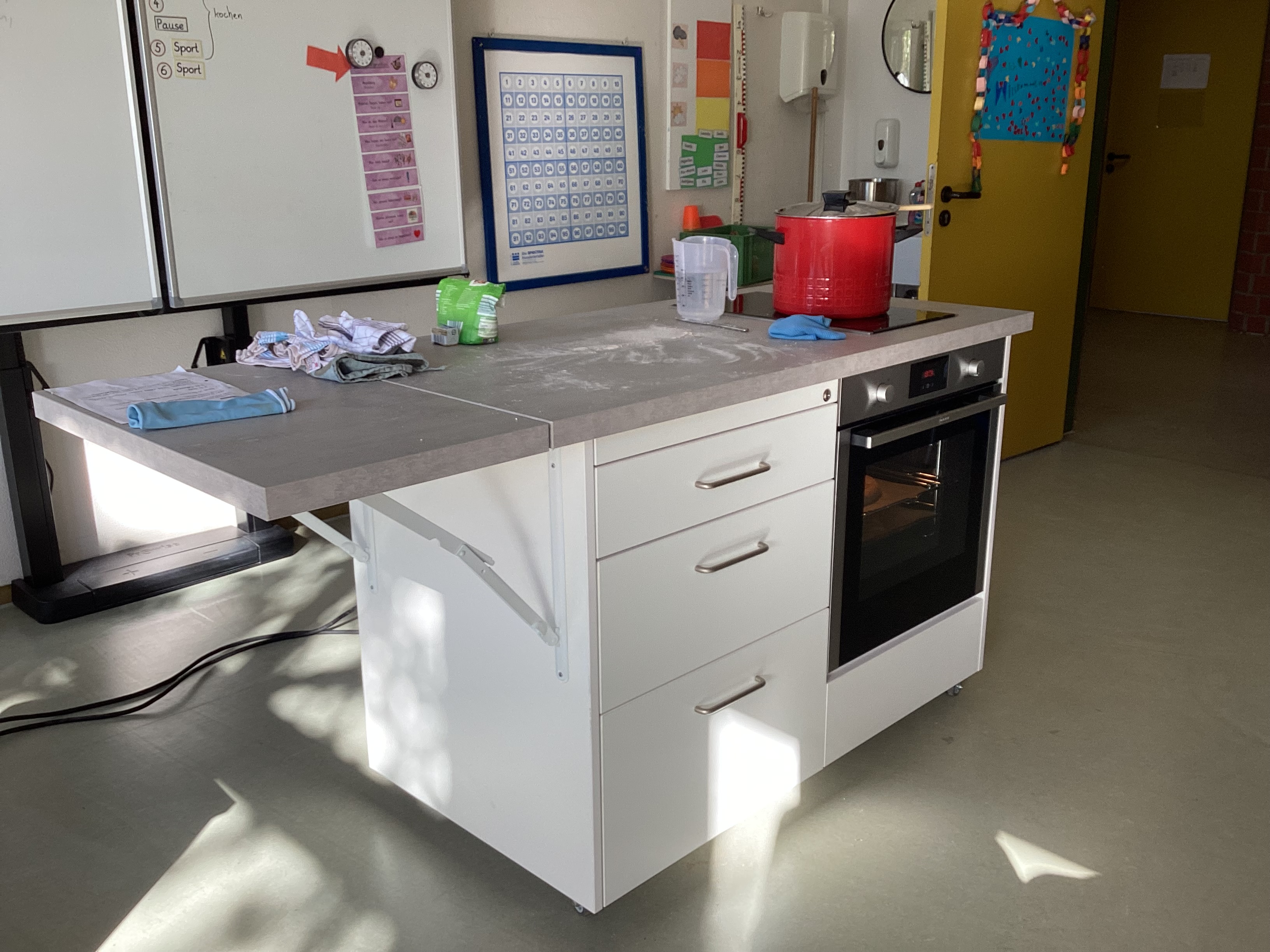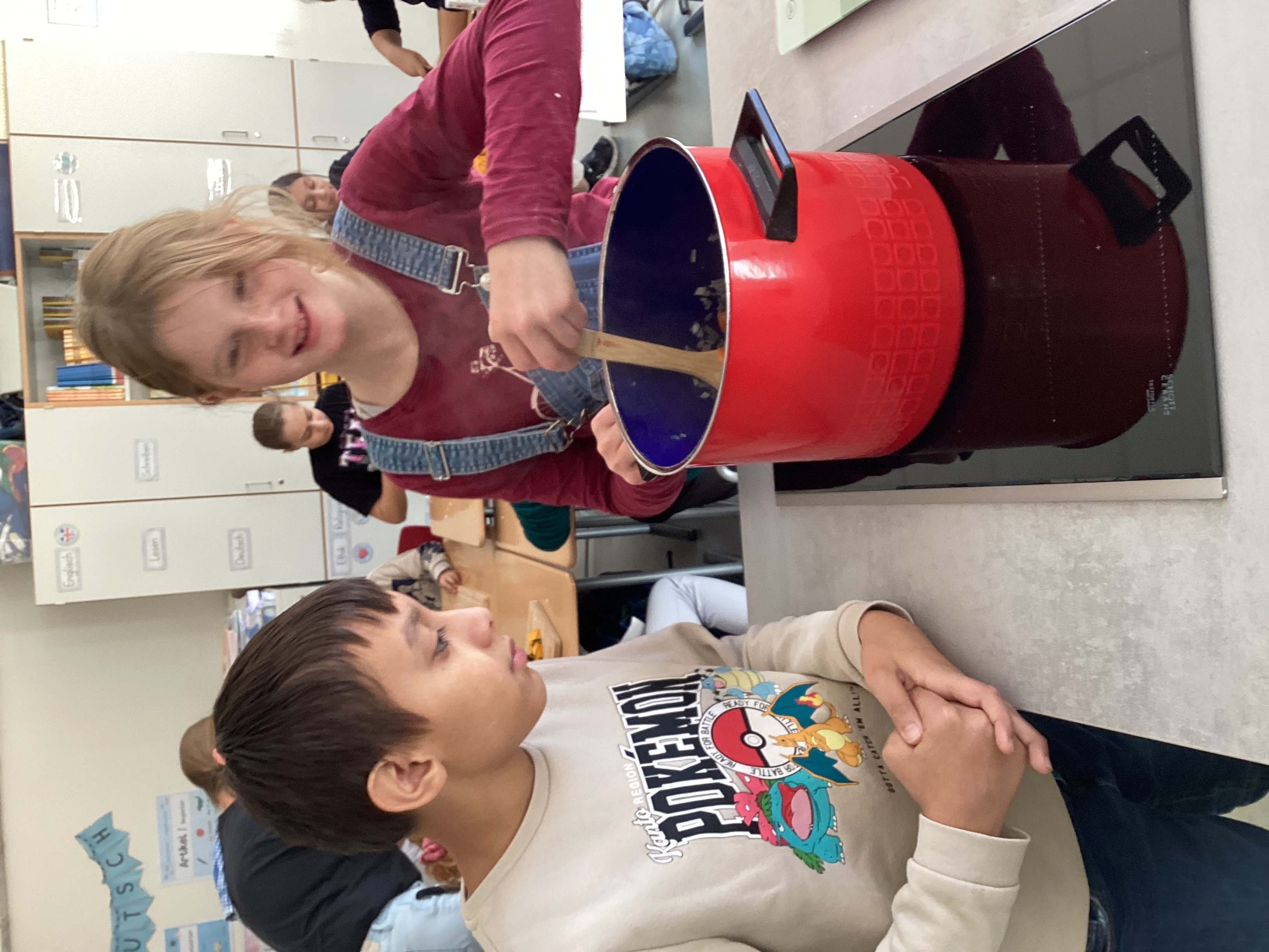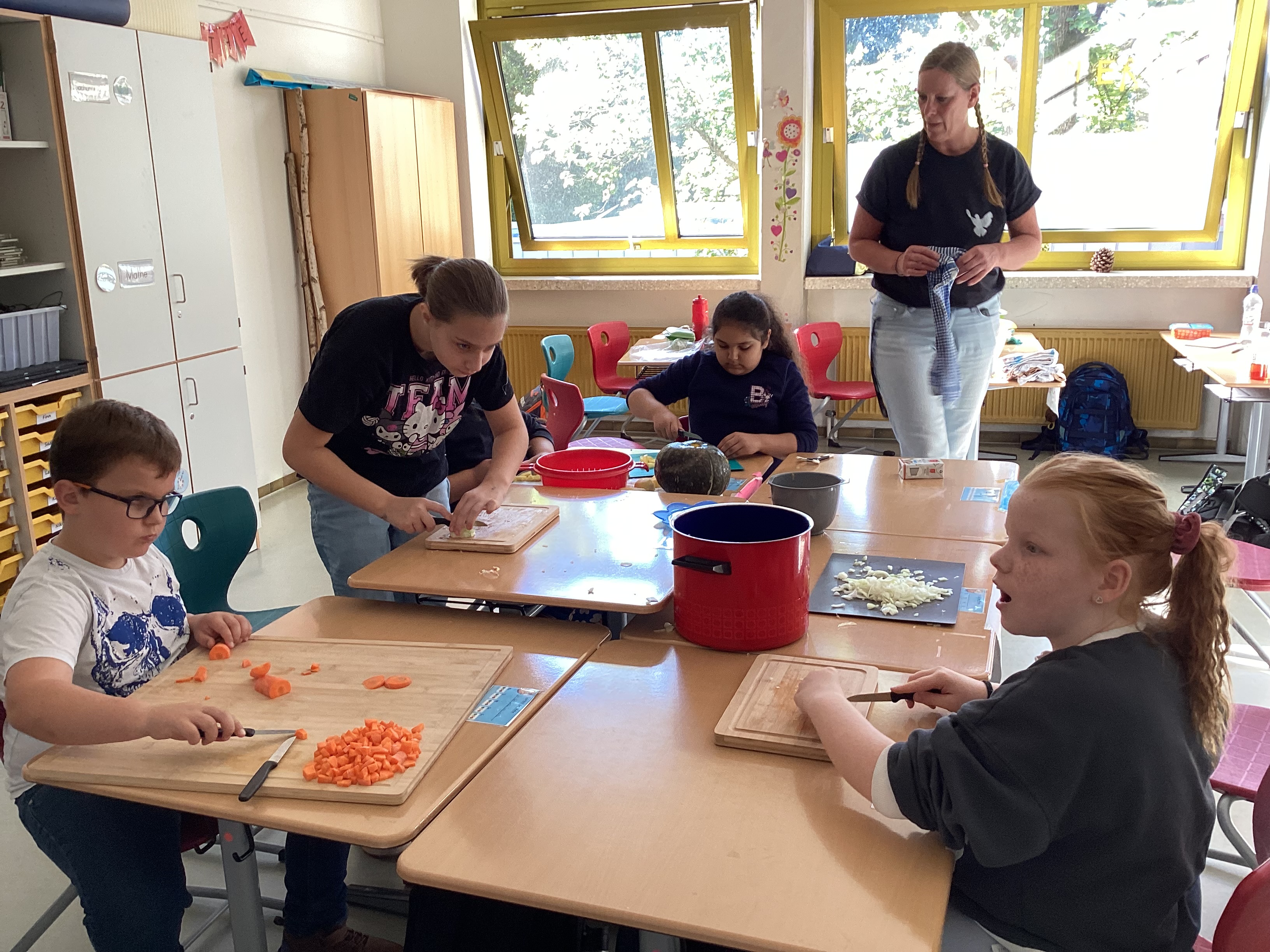 Schülerinnen und Schüler der Klasse 3 / 4 nutzten in der vergangenen Woche den mobilen Küchenwagen um in der Klasse unter Leitung von Frau Goltsch eine leckere Kürbissuppe zu zaubern.